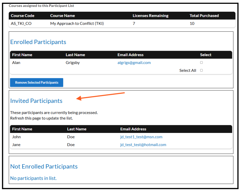 The list of names you added will now appear at the bottom of the Participant List page under Not Enrolled Participants. If you need to remove them you can do so here.